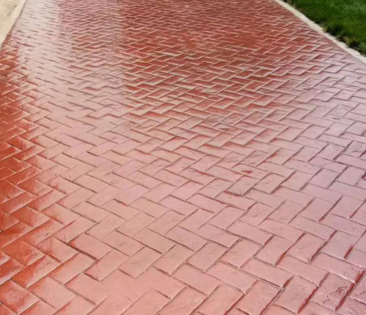 5、使用艺术地坪模具对地坪面层进行纹理处理。艺术地坪模具应配套使用,首先确定好纹理的分布方向,选好第 一块模具放置的位置和角度,然后其它的模具依次紧贴第 一块模具放置。彩色混凝土艺术地坪压模采用人工压模,压模应由技术较好的人员进行作业以保证压纹深度一致和模具放置的准确性。